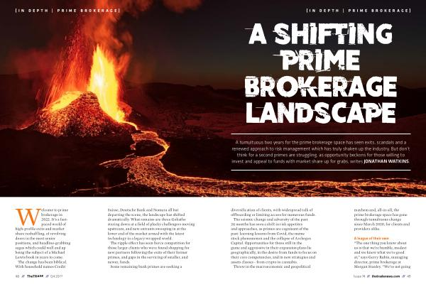 A tumultuous two years for the prime brokerage space has seen exits , scandals and a renewed approach to risk management which has truly shaken up the industry . But don ’ t think for a second primes are struggling , as opportunity beckons for those willing to invest and appeal to funds with market share up for grabs , writes JONATHAN WATKINS .