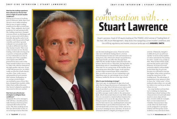 How has the trading experience been altered over the last few years in light of current market conditions ? During my 19 years of working prior to February 2020 , there was always a strict understanding that no one in equity trading would ever be able to work from home . Then , suddenly , the Covid pandemic hit and automatically the trading experience changed in terms of how we did things and how we interacted with brokers . Initially , during the early Covid months , with the periods of high volatility and where spreads widened , we saw people tend to trade in different ways than they had previously . There was a clear increase in over the day trading , with traders trying to be as passive as humanly possible to cover themselves in case of intraday news flow . Liquidity sourcing became difficult primarily because some of the larger market makers were trying to reduce the risks for themselves through smaller risk sizes . From a UBS AM perspective , we didn ’ t really see this but it had a knockon effect . Now , with a macro and geopolitical environment that remains challenging , we are seeing certain brokers succeeding because of how they have changed their models , while others have suffered because they haven ’ t adapted as quickly or innovated in this new market .