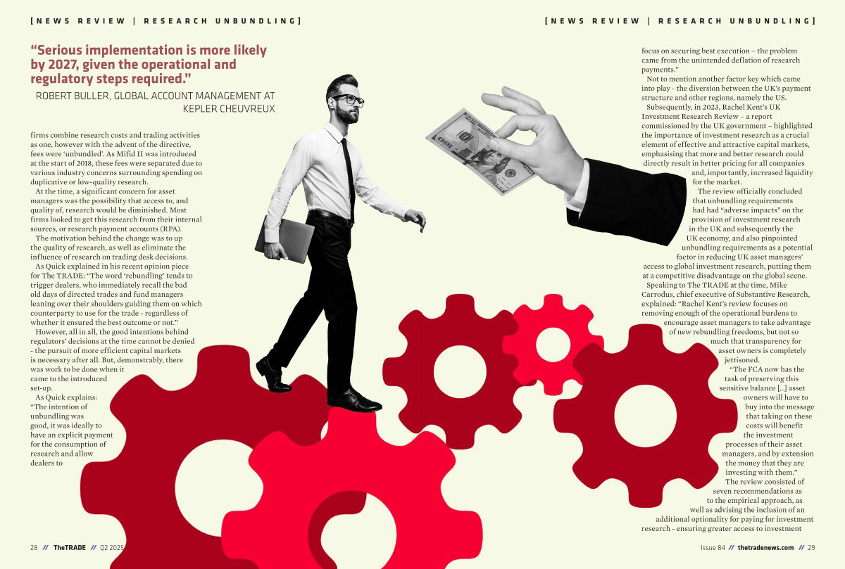 The review officially concluded that unbundling requirements had had“ adverse impacts” on the provision of investment research in the UK and subsequently the UK economy, and also pinpointed unbundling requirements as a potential factor in reducing UK asset managers’ access to global investment research, putting them at a competitive disadvantage on the global scene. Speaking to The TRADE at the time, Mike Carrodus, chief executive of Substantive Research, explained:“ Rachel Kent’ s review focuses on removing enough of the operational burdens to encourage asset managers to take advantage of new rebundling freedoms, but not so much that transparency for asset owners is completely jettisoned.“ The FCA now has the task of preserving this sensitive balance […] asset owners will have to buy into the message that taking on these costs will benefit the investment processes of their asset managers, and by extension the money that they are investing with them.” The review consisted of seven recommendations as to the empirical approach, as well as advising the inclusion of an additional optionality for paying for investment research- ensuring greater access to investment