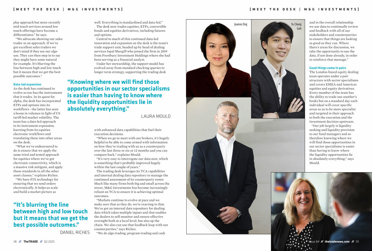 Good things come in pairs The London-based equity dealing team operates under a pair structure with sector specialisms and covers EMEA and Americas equities and equity derivatives. Every member of the team has the ability to trade one another’ s books but on a standard day each individual will cover specific areas so as to be more specialist and targeted in their approach to both the execution and the investment decision upstream.“ Our job largely is liquidity seeking and liquidity provision to our fund managers and so therefore knowing where we will find those opportunities in our sector specialisms is easier than having to know where the liquidity opportunities lie in absolutely everything,” says Mould.