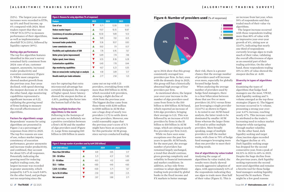 Rating algo performance The top five algorithm features identified in this year’ s survey remained fairly consistent from 2024: ease of use, customer support, anonymity, increased trader productivity and execution consistency( Figure 1). While most categories showed modest growth from the previous year, four areas declined, with speed showing the steepest decrease at-0.10. On the other hand, algo monitoring capabilities represented a significant increase at 0.22, validating the growing trend of firms looking to measure the overall effectiveness of algorithms.