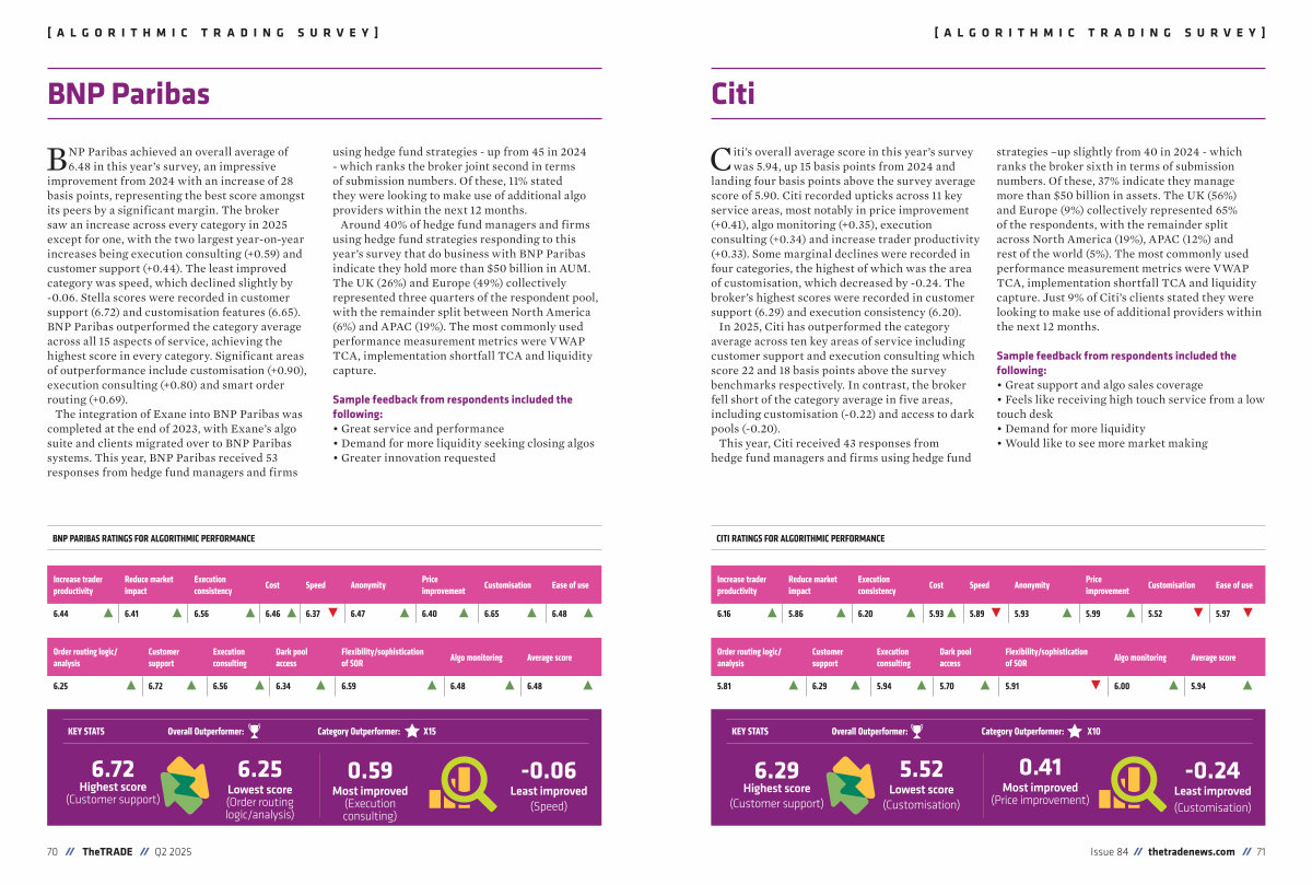 Citi’ s overall average score in this year’ s survey was 5.94, up 15 basis points from 2024 and landing four basis points above the survey average score of 5.90. Citi recorded upticks across 11 key service areas, most notably in price improvement(+ 0.41), algo monitoring(+ 0.35), execution consulting(+ 0.34) and increase trader productivity(+ 0.33). Some marginal declines were recorded in four categories, the highest of which was the area of customisation, which decreased by-0.24. The broker’ s highest scores were recorded in customer support( 6.29) and execution consistency( 6.20). In 2025, Citi has outperformed the category average across ten key areas of service including customer support and execution consulting which score 22 and 18 basis points above the survey benchmarks respectively. In contrast, the broker fell short of the category average in five areas, including customisation(-0.22) and access to dark pools(-0.20).