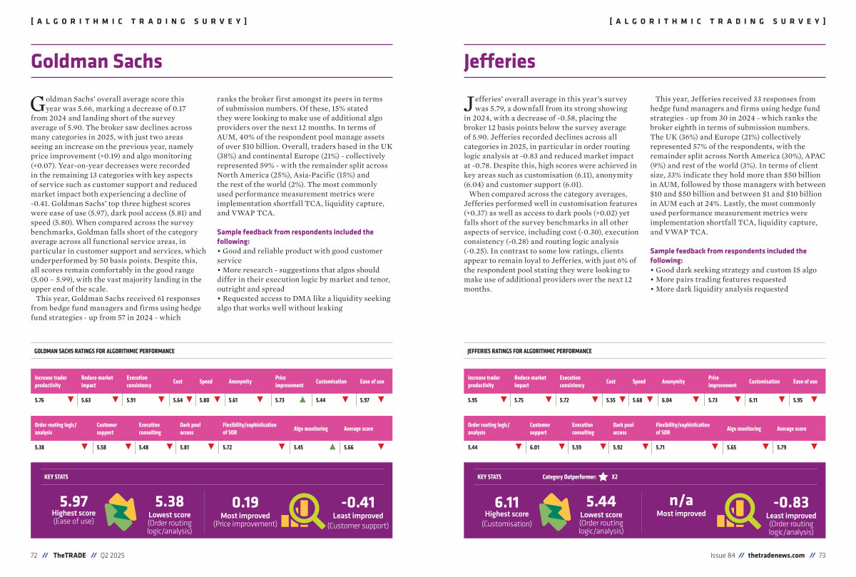 This year, Goldman Sachs received 61 responses from hedge fund managers and firms using hedge fund strategies- up from 57 in 2024- which ranks the broker first amongst its peers in terms of submission numbers. Of these, 15 % stated they were looking to make use of additional algo providers over the next 12 months. In terms of AUM, 40 % of the respondent pool manage assets of over $ 10 billion. Overall, traders based in the UK( 38 %) and continental Europe( 21 %)- collectively represented 59 %- with the remainder split across North America( 25 %), Asia-Pacific( 15 %) and the rest of the world( 2 %). The most commonly used performance measurement metrics were implementation shortfall TCA, liquidity capture, and VWAP TCA.