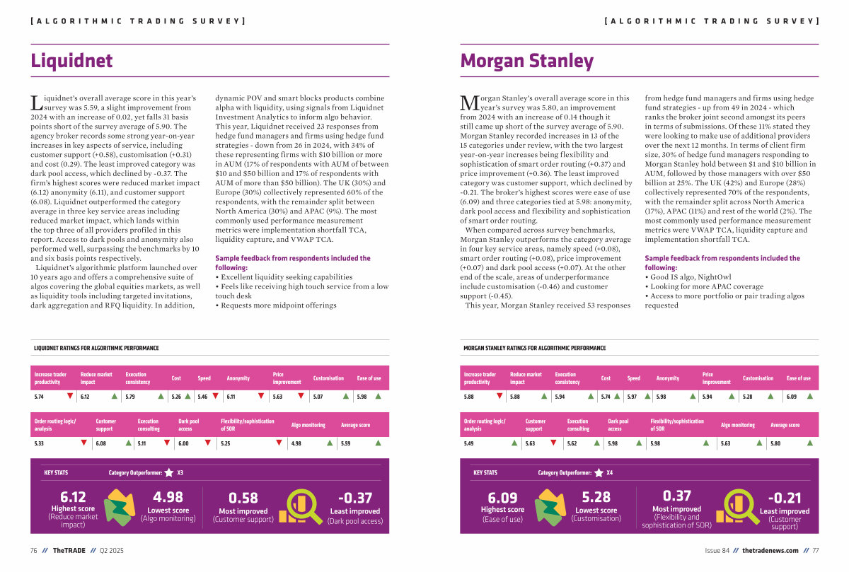 Liquidnet’ s overall average score in this year’ s survey was 5.59, a slight improvement from 2024 with an increase of 0.02, yet falls 31 basis points short of the survey average of 5.90. The agency broker records some strong year-on-year increases in key aspects of service, including customer support(+ 0.58), customisation(+ 0.31) and cost( 0.29). The least improved category was dark pool access, which declined by-0.37. The firm’ s highest scores were reduced market impact( 6.12) anonymity( 6.11), and customer support( 6.08). Liquidnet outperformed the category average in three key service areas including reduced market impact, which lands within the top three of all providers profiled in this report. Access to dark pools and anonymity also performed well, surpassing the benchmarks by 10 and six basis points respectively.