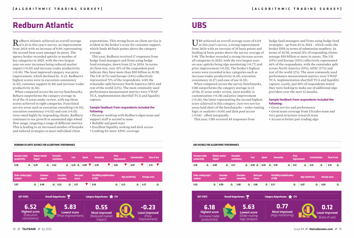 UBS achieved an overall average score of 6.04 in this year’ s survey, a strong improvement from 2024 with an increase of 35 basis points and landing 14 basis points above the survey average of 5.90. The broker recorded a strong increase across all categories in 2025, with the two largest yearon-year upticks being algo monitoring(+ 0.77) and price improvement(+ 0.52). The broker ' s highest scores were recorded in key categories such as increase trader productivity( 6.18), execution consistency( 6.17) and ease of use( 6.15).