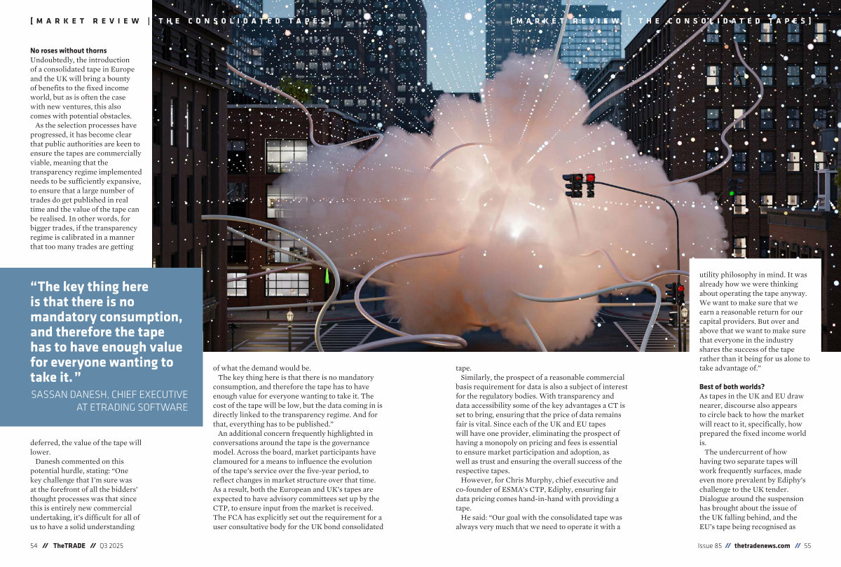 An additional concern frequently highlighted in conversations around the tape is the governance model. Across the board, market participants have clamoured for a means to influence the evolution of the tape’ s service over the five-year period, to reflect changes in market structure over that time. As a result, both the European and UK’ s tapes are expected to have advisory committees set up by the CTP, to ensure input from the market is received. The FCA has explicitly set out the requirement for a user consultative body for the UK bond consolidated