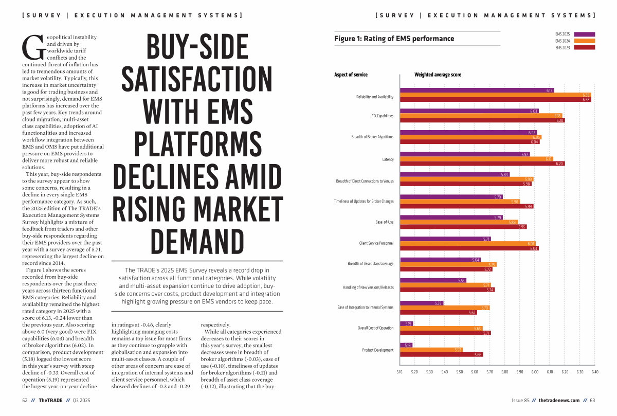 The TRADE’ s 2025 EMS Survey reveals a record drop in satisfaction across all functional categories. While volatility and multi-asset expansion continue to drive adoption, buyside concerns over costs, product development and integration highlight growing pressure on EMS vendors to keep pace.