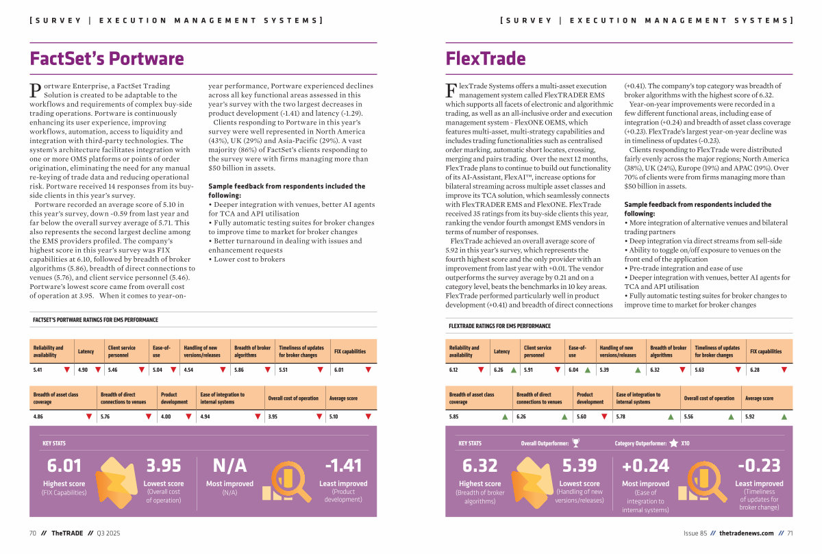 FlexTrade Systems offers a multi-asset execution management system called FlexTRADER EMS which supports all facets of electronic and algorithmic trading, as well as an all-inclusive order and execution management system- FlexONE OEMS, which features multi-asset, multi-strategy capabilities and includes trading functionalities such as centralised order marking, automatic short locates, crossing, merging and pairs trading. Over the next 12 months, FlexTrade plans to continue to build out functionality of its AI-Assistant, FlexAI™, increase options for bilateral streaming across multiple asset classes and improve its TCA solution, which seamlessly connects with FlexTRADER EMS and FlexONE. FlexTrade received 35 ratings from its buy-side clients this year, ranking the vendor fourth amongst EMS vendors in terms of number of responses.