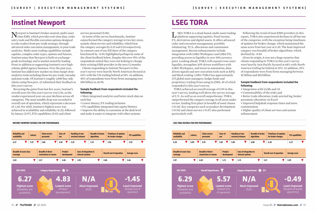 Reversing the gains from last few years, Instinet’ s overall score for this year’ s survey was 5.46, as the vendor experienced year-on-year declines across all categories. The most notable drop was recorded in overall cost of operation, which represents a decrease of-1.45. For 2025, Instinet’ s highest score was achieved in availability and reliability( 6.21), followed by latency( 5.97), FIX capabilities( 5.92) and client service personnel( 5.86).