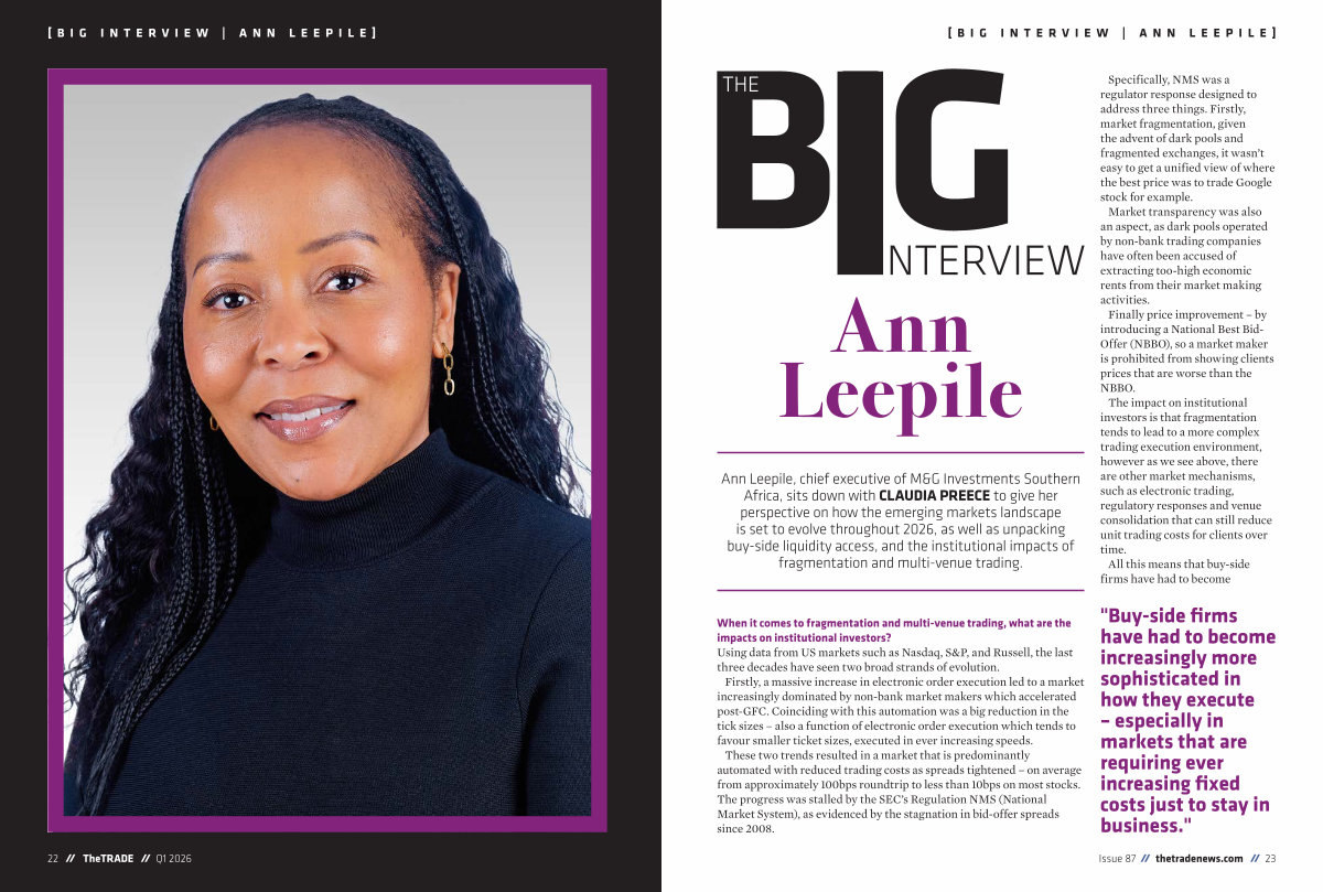 Ann Leepile, chief executive of M & G Investments Southern Africa, sits down with CLAUDIA PREECE to give her perspective on how the emerging markets landscape is set to evolve throughout 2026, as well as unpacking buy-side liquidity access, and the institutional impacts of fragmentation and multi-venue trading.
