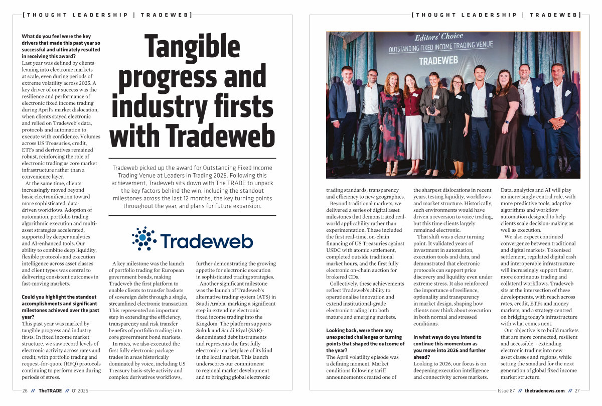 Tradeweb picked up the award for Outstanding Fixed Income Trading Venue at Leaders in Trading 2025. Following this achievement, Tradeweb sits down with The TRADE to unpack the key factors behind the win, including the standout milestones across the last 12 months, the key turning points throughout the year, and plans for future expansion.