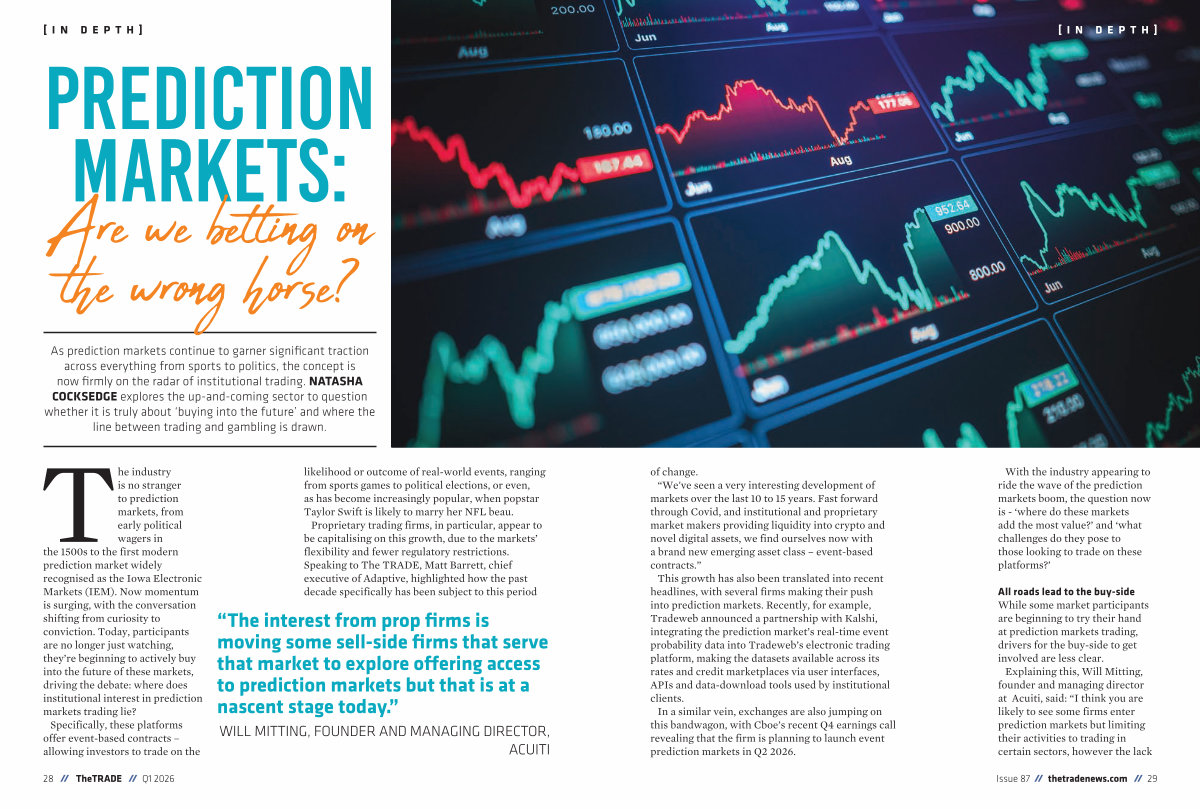 This growth has also been translated into recent headlines, with several firms making their push into prediction markets. Recently, for example, Tradeweb announced a partnership with Kalshi, integrating the prediction market’ s real-time event probability data into Tradeweb’ s electronic trading platform, making the datasets available across its rates and credit marketplaces via user interfaces, APIs and data-download tools used by institutional clients.