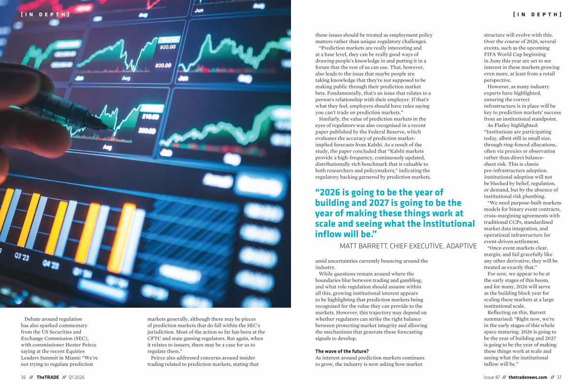 Debate around regulation has also sparked commentary from the US Securities and Exchange Commission( SEC), with commissioner Hester Peirce saying at the recent Equities Leaders Summit in Miami:“ We ' re not trying to regulate prediction markets generally, although there may be pieces of prediction markets that do fall within the SEC ' s jurisdiction. Most of the action so far has been at the CFTC and state gaming regulators. But again, when it relates to issuers, there may be a case for us to regulate them.”