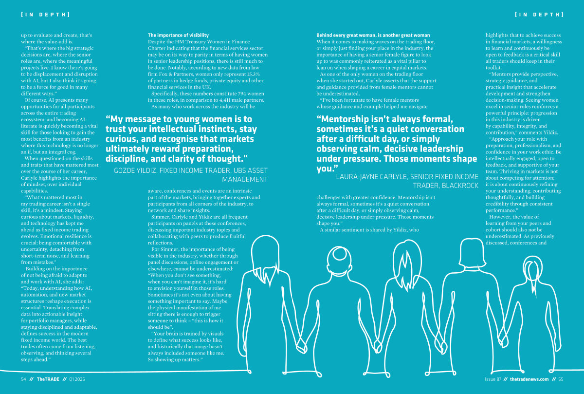 Behind every great woman, is another great woman When it comes to making waves on the trading floor, or simply just finding your place in the industry, the importance of having a senior female figure to look up to was commonly reiterated as a vital pillar to lean on when shaping a career in capital markets.