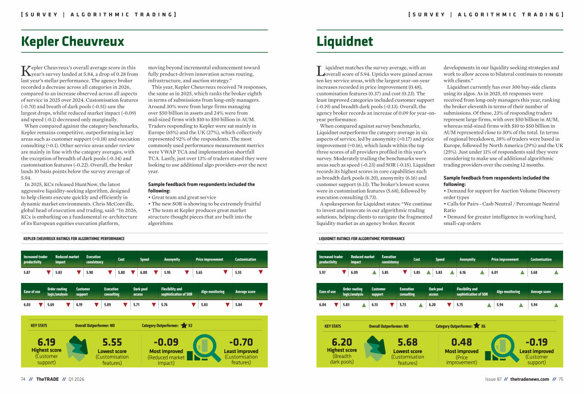 Kepler Cheuvreux’ s overall average score in this year’ s survey landed at 5.84, a drop of 0.28 from last year’ s stellar performance. The agency broker recorded a decrease across all categories in 2026, compared to an increase observed across all aspects of service in 2025 over 2024. Customisation features(-0.70) and breath of dark pools(-0.51) saw the largest drops, whilst reduced market impact(-0.09) and speed(-0.1) decreased only marginally.