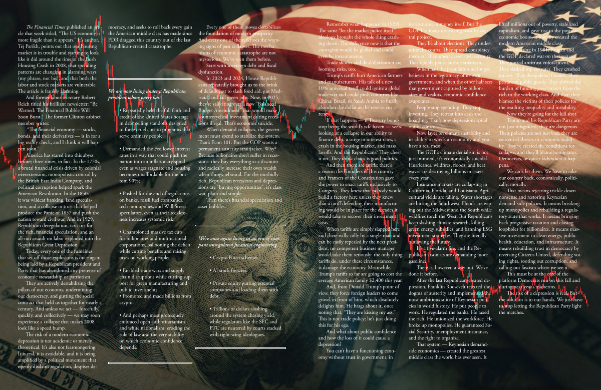 They are actively destabilizing the pillars of our economy, undermining our democracy, and gutting the social contract that held us together for nearly a century. And unless we act— forcefully, quickly, and collectively— we may soon experience a collapse that makes 2008 look like a speed bump.