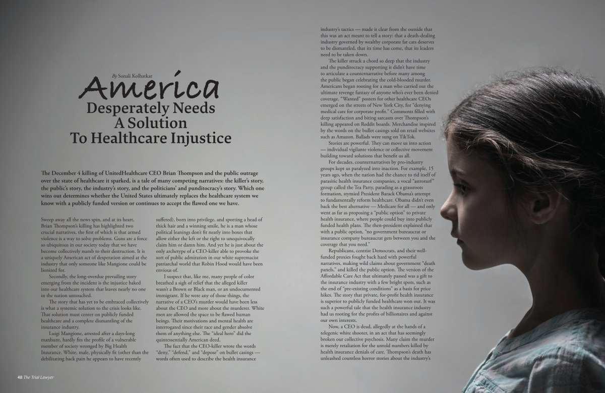 The killer struck a chord so deep that the industry and the punditocracy supporting it didn ’ t have time to articulate a counternarrative before many among the public began celebrating the cold-blooded murder . Americans began rooting for a man who carried out the ultimate revenge fantasy of anyone who ’ s ever been denied coverage . “ Wanted ” posters for other healthcare CEOs emerged on the streets of New York City , for “ denying medical care for corporate profit .” Comments filled with deep satisfaction and biting sarcasm over Thompson ’ s killing appeared on Reddit boards . Merchandise inspired by the words on the bullet casings sold on retail websites such as Amazon . Ballads were sung on TikTok .