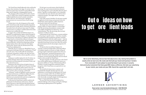 US soft power was and remains a kind of political advertising . The usual commercial advertiser promotes only everything positive ( real or plausible ) about his client ’ s product . Typically , everything negative ( real or plausible ) is associated by that same advertiser only with his client ’ s competitor ’ s product . One might call this “ advertising communication .”