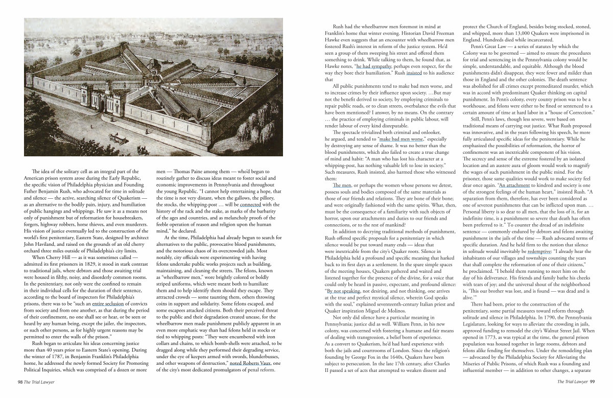 Rush had the wheelbarrow men foremost in mind at Franklin’ s home that winter evening. Historian David Freeman Hawke even suggests that an encounter with wheelbarrow men fostered Rush’ s interest in reform of the justice system. He’ d seen a group of them sweeping his street and offered them something to drink. While talking to them, he found that, as Hawke notes,“ he had sympathy, perhaps even respect, for the way they bore their humiliation.” Rush insisted to his audience that