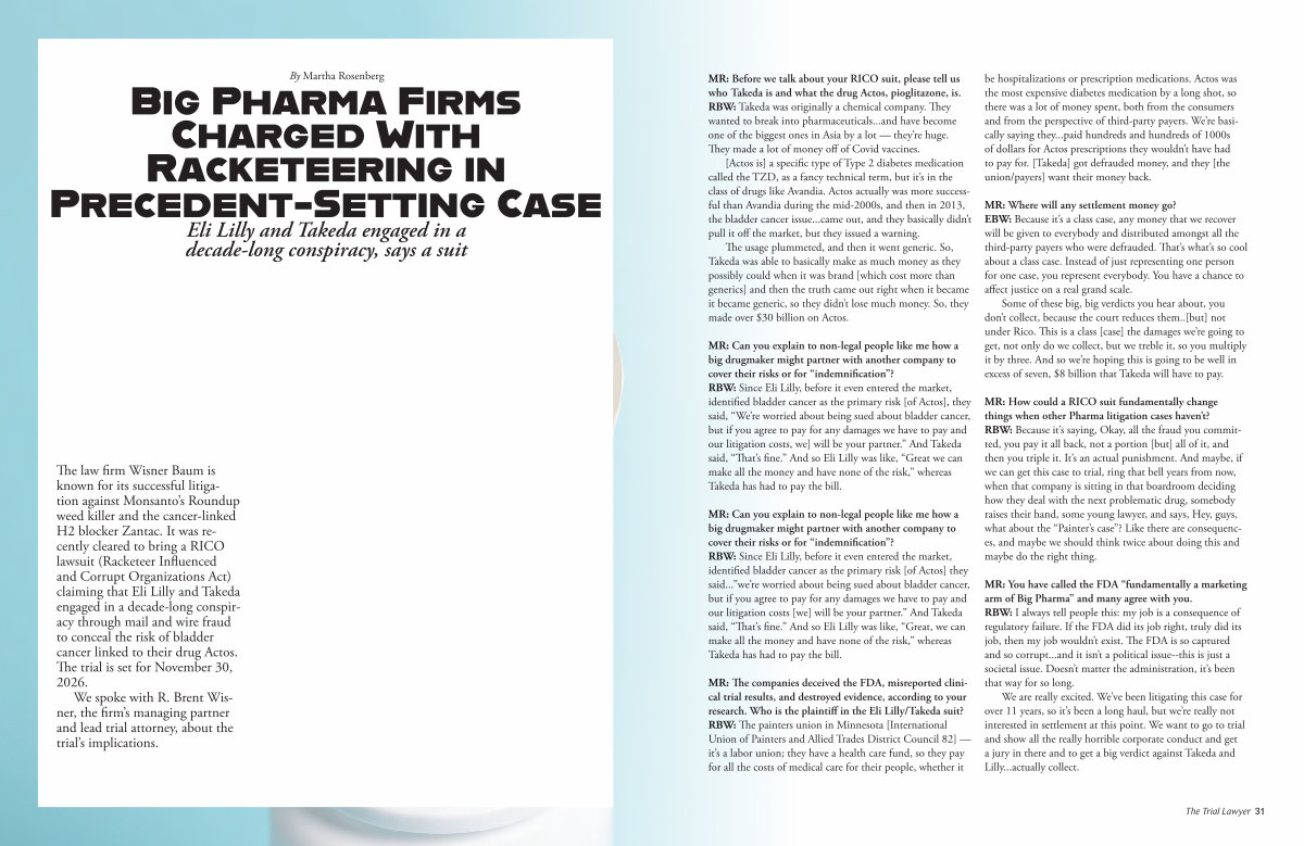MR: Before we talk about your RICO suit, please tell us who Takeda is and what the drug Actos, pioglitazone, is. RBW: Takeda was originally a chemical company. They wanted to break into pharmaceuticals... and have become one of the biggest ones in Asia by a lot— they’ re huge. They made a lot of money off of Covid vaccines.
