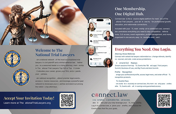 Join a national network of the most accomplished trial lawyers in civil plaintiff and criminal defense law. Whether you’ re a seasoned leader or a rising attorney, membership in The National Trial Lawyers Top 100 or Top 40 Under 40 elevates your career, grows your firm, and expands your business.