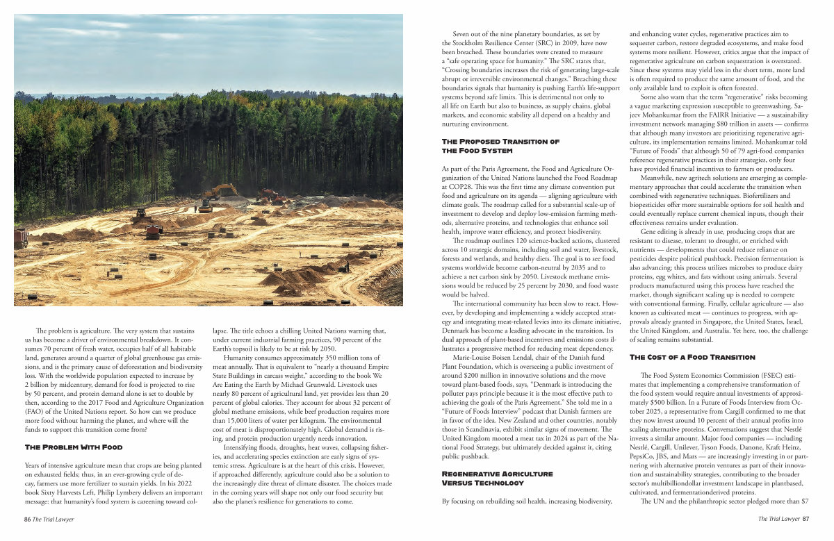 The problem is agriculture. The very system that sustains us has become a driver of environmental breakdown. It consumes 70 percent of fresh water, occupies half of all habitable land, generates around a quarter of global greenhouse gas emissions, and is the primary cause of deforestation and biodiversity loss. With the worldwide population expected to increase by 2 billion by midcentury, demand for food is projected to rise by 50 percent, and protein demand alone is set to double by then, according to the 2017 Food and Agriculture Organization( FAO) of the United Nations report. So how can we produce more food without harming the planet, and where will the funds to support this transition come from?