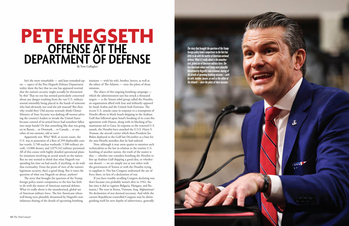 The story that brought the question of the Trump foreign policy team’ s competence to the fore has little to do with the matter of American national defense. What it’ s really about is the unauthorized, global use of American military force. The few Americans whose well-being were plausibly threatened by Hegseth’ s now infamous sharing of the details of upcoming bombing missions— with his wife, brother, lawyer, as well as the editor of The Atlantic— were the pilots of those missions.