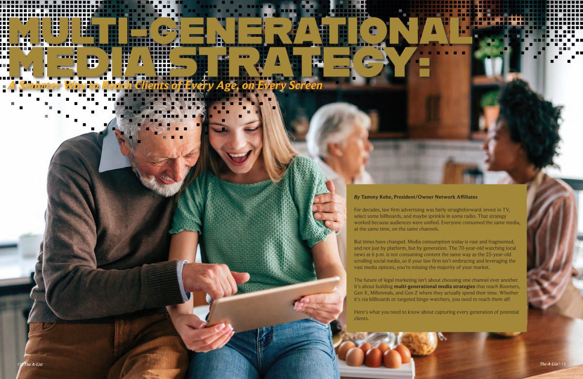 But times have changed. Media consumption today is vast and fragmented, and not just by platform, but by generation. The 70-year-old watching local news at 6 p. m. is not consuming content the same way as the 25-year-old scrolling social media, so if your law firm isn’ t embracing and leveraging the vast media options, you’ re missing the majority of your market.
