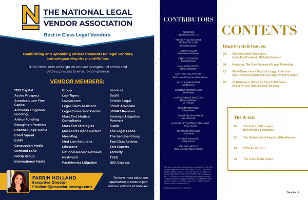 The A-List magazine is published as a supplement to The Trial Lawyer Magazine by The Trial Lawyer, Inc., 430 West Main Street, Dothan, AL 36301. The Trial Lawyer, Vol. XIII, No. 1, Spring 2026( ISSN 2159-7413) © 2026, The Trial Lawyer, Inc.— All rights reserved. Reproduction in whole or in part without permission is strictly prohibited. POSTMASTER: Send address changes to The Trial Lawyer, Inc., 430 West Main Street, Dothan, Alabama 36301.