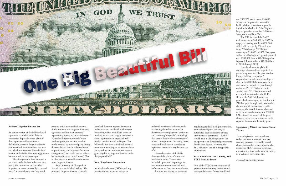 An earlier version of the BBB included a punitive tax on litigation finance companies. Especially when plaintiff firms oppose wealthy corporate defendants, access to litigation finance can be critical. Many opposed the new tax, which was removed from the final version of the BBB. Unsurprisingly, many believe it will be proposed again.