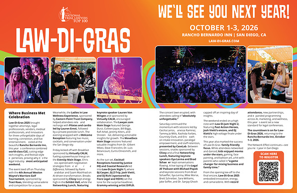 Law-Di-Gras 2025 brought together attorneys, legal professionals, vendors, medical professionals, and innovators for three unforgettable days of learning, connection, and live entertainment. Hosted at the beautiful Rancho Bernardo Inn, this year’ s conference combined world-class CLE, cutting-edge tech insights, and festival-style experiences, proving why it’ s the legal industry’ s most anticipated weekend.