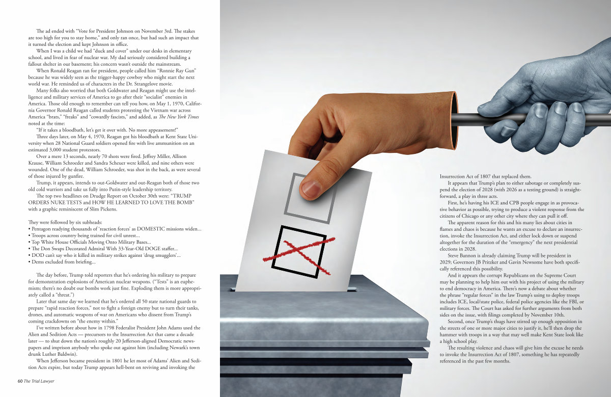 The apparent reason for this and his many lies about cities in flames and chaos is because he wants an excuse to declare an insurrection, invoke the Insurrection Act, and either lock down or suspend altogether for the duration of the“ emergency” the next presidential elections in 2028.