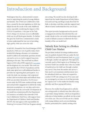 cost study and development of a cost model . This work was interrupted by the COVID-19 pandemic and the study team opted not to add additional burden to providers by requesting their participation . As a result , the study was missing a vital component in that it did not include input and feedback from child care providers themselves . For this most recent study , the P5FS team conducted deep constituent and provider engagement to inform the study , determine assumptions , vet cost data , and review initial results from the cost model . Development of the model was commissioned by the Department of Commerce on behalf of the statewide Child Care Collaborative Task Force , with support from the Department of Children , Youth and Families ( DCYF ), the state agency with responsibility for Working Connections Child Care Program subsidy rate setting . The model was also developed with input from the Seattle Department of Early Education and Learning , and King County Best Start for Kids , to develop a tool that could also support local efforts to better understand the true cost of care .
