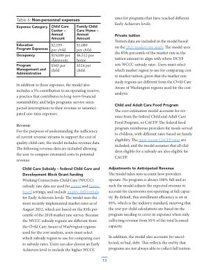Revenue For the purposes of understanding the sufficiency of current revenue streams to support the cost of quality child care , the model includes revenue data . The following revenue data are included allowing the user to compare estimated costs to potential revenue :