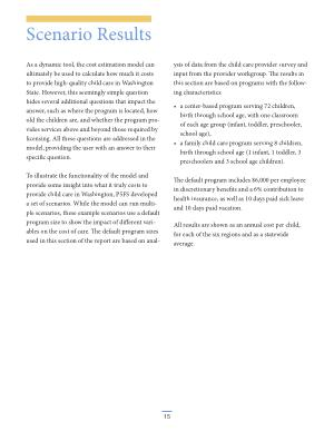 To illustrate the functionality of the model and provide some insight into what it truly costs to provide child care in Washington , P5FS developed a set of scenarios . While the model can run multiple scenarios , these example scenarios use a default program size to show the impact of different variables on the cost of care . The default program sizes used in this section of the report are based on analysis of data from the child care provider survey and input from the provider workgroup . The results in this section are based on programs with the following characteristics :