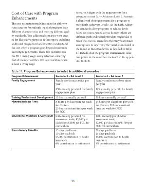The cost estimation model includes the ability to run scenarios for multiple types of programs with different characteristics and meeting different quality standards . Two additional scenarios were created for illustrative purposes in this report , including additional program enhancements to understand the cost when a program goes beyond minimum licensing requirements . These two scenarios use the MIT Living Wage salary selection , ensuring that all members of the child care workforce earn at least a living wage .