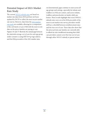 As demonstrated , gaps continue to exist across all age groups and settings , especially for infants and toddlers in child care centers , and across infants , toddlers and preschoolers in family child care homes . These results highlight that even if WCCC subsidy rates were set at the 85th percentile of the most recent market rate survey , providers would still face a shortfall between reimbursement rates and the true cost of care . These data also show that the prices private-pay families are currently able to afford are also insufficient meaning that child care providers cannot cover the true cost of care through either WCCC subsidy or parent tuition .