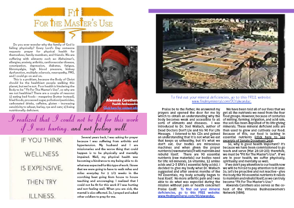This is a problem, because the Body of Christ should be the healthiest people walking this planet, but we're not. Poor health is hindering the Body to be " Fit For The Master's Use", so why are we not healthier? There are a couple of reasons: 1) eating bad foods - margarine (butter instead), fried foods, processed sugar, pollution/pesticides, carbonated drinks, caffeine, gluten - increasing sensitivity to wheat, barley, rye and oats; 2) being nutritionally deficient.