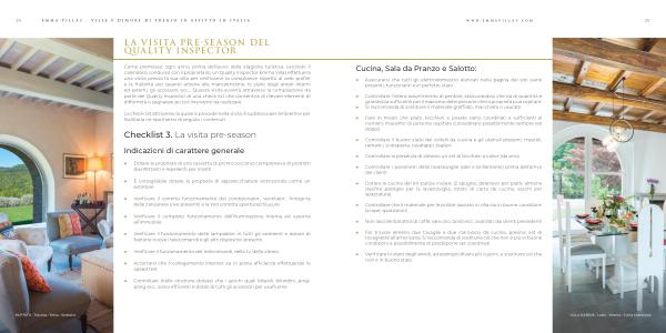 Come premesso , ogni anno , prima dell ’ avvio della stagione turistica , secondo il calendario condiviso con il proprietario , un Quality Inspector Emma Villas effettuerà una visita presso la sua villa per verificarne la compliance rispetto al web profile e la fruibilità per quanto attiene alla manutenzione , lo stato degli arredi interni ed esterni , gli accessori , ecc ... Questa visita avverrà attraverso la compilazione da parte del Quality Inspector di una check list che consentirà di rilevare elementi di difformità o segnalare piccoli interventi da realizzare .
