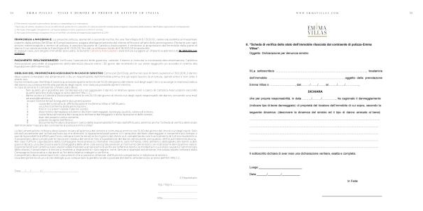 • inviare tramite email la seguente documentazione : a . copia del contratto di affitto / locazione tra Emma Villas e l ’ affittuario ; b . voucher / conferma della prenotazione ; c . foto in cui è ben visibile il danno subito ; d . descrizione dettagliata ed elenco dei beni danneggiati , tipologia , qualità , valore ed utilizzo ; e . copia fattura / ricevuta del riacquisto del bene danneggiato o della riparazione dello stesso ; f . iban del proprio conto corrente ; g . proprio recapito telefonico ; h . documento / modulo di presa in carico della responsabilità firmato dall ’ affittuario , definito anche “ Scheda di verifica dello stato dell ’ immobile rilasciata dal contraente di polizza-Emma Villas ”.