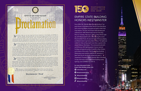 Since 2004, the“ World’ s Most Famous Building” has paid tribute to the Westminster Kennel Club Dog Show with a stunning display of purple and gold in New York City’ s skyline. This year, the Empire State Building will celebrate the 150th Westminster Kennel Club Dog Show on Tuesday, February 3, 2026, as they fill the night sky with Westminster’ s iconic colors during the Junior Showmanship Finals, the second night of Group judging, and Westminster’ s top honor, Best in Show. The lights are visible for miles as they reach more than a quarter mile above Midtown Manhattan. This renowned landmark’ s world-famous LED lighting system honors national holidays and special events of interest to New Yorkers and citizens of the world. The Empire State Building Observatory was recently voted the # 1 attraction in New York City for the fourth consecutive year in Tripadvisor’ s Travelers’ Choice Awards: Best of the Best. To stay informed on all Empire State Building tower lightings, text CONNECT to 274-16.