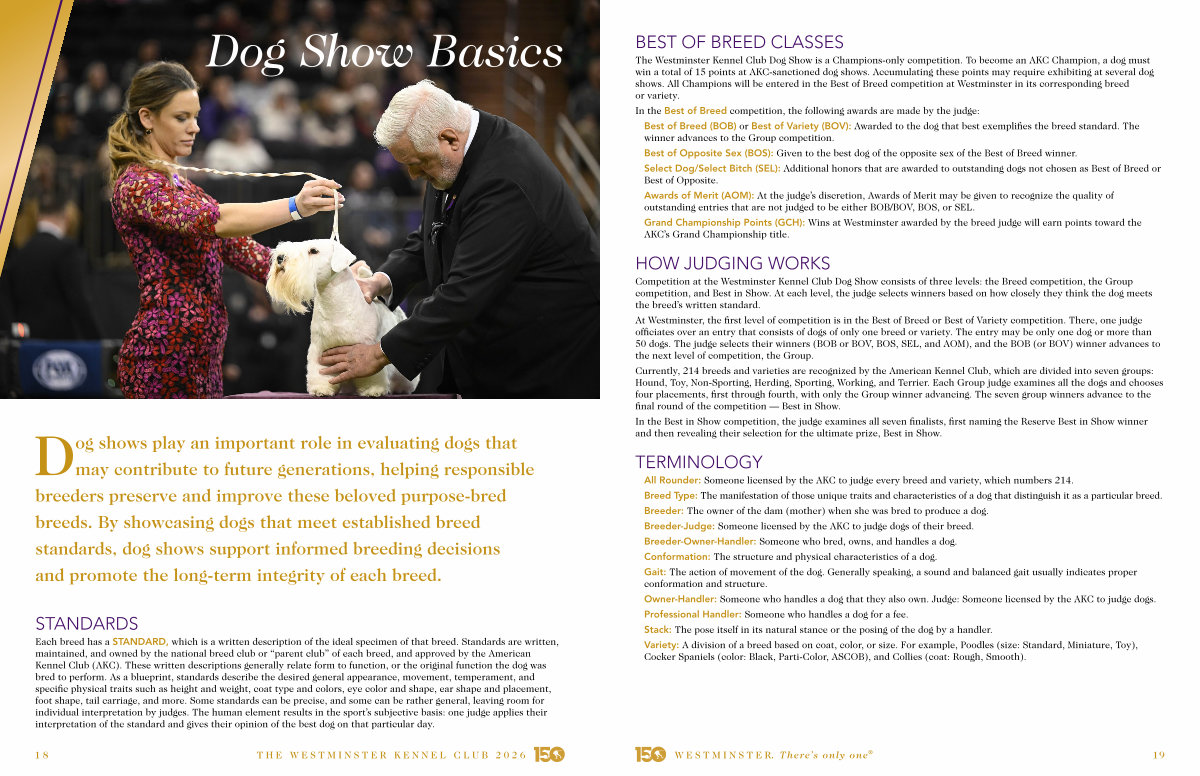 Competition at the Westminster Kennel Club Dog Show consists of three levels: the Breed competition, the Group competition, and Best in Show. At each level, the judge selects winners based on how closely they think the dog meets the breed’ s written standard.