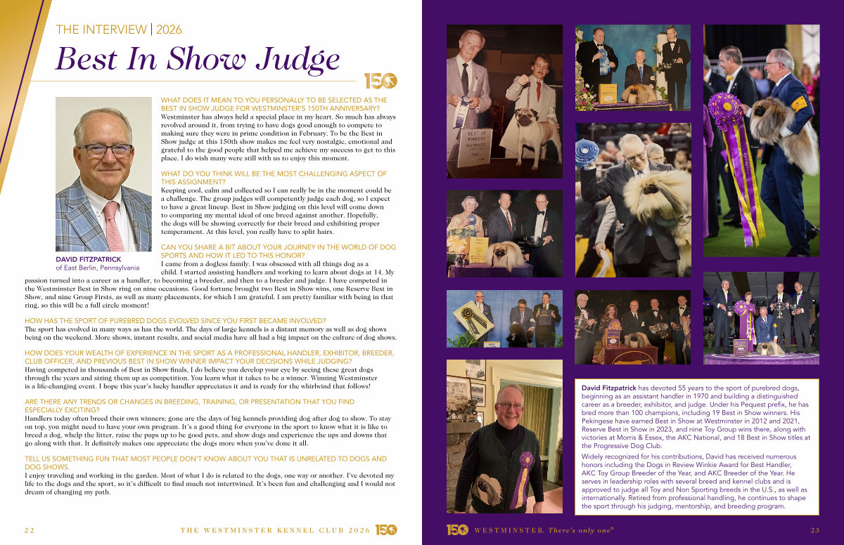 WHAT DOES IT MEAN TO YOU PERSONALLY TO BE SELECTED AS THE BEST IN SHOW JUDGE FOR WESTMINSTER’ S 150TH ANNIVERSARY? Westminster has always held a special place in my heart. So much has always revolved around it, from trying to have dogs good enough to compete to making sure they were in prime condition in February. To be the Best in Show judge at this 150th show makes me feel very nostalgic, emotional and grateful to the good people that helped me achieve my success to get to this place. I do wish many were still with us to enjoy this moment.