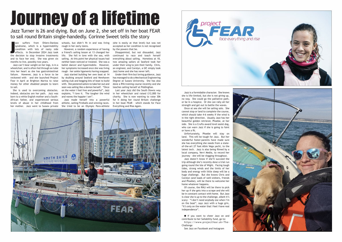 Jazz Turner is 26 and dying. But on June 2, she set off in her boat FEAR to sail round Britain single-handedly. Corinne Sweet tells the story