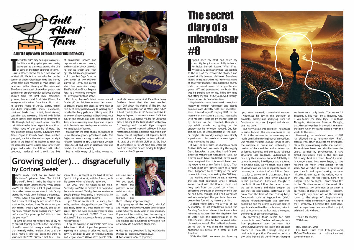 must also come down. And it’ s with a heavy feathered heart that the news reached your Gull about the closing of The Set, her favourite restaurant for so many years when it held court in the Artist’ Residence Hotel in Regency Square. Its current home at Café Rust is where the Gull family will be for Christmas dinner, picking at the fried chicken with gravy & trimmings which include Aligot, merguez stuffing, creamed mustard cabbage & butter roasted maple roots, a glorious finale from Dan Kenny, one of Brighton’ s chef legends. Great Uncle Gulliver still regales the teen gulls with his tales of the rich bin pickings at the back of Dan’ s house in Ho Chi Minh city where he lived for two years before moving to Brighton to work at the Gingerman.