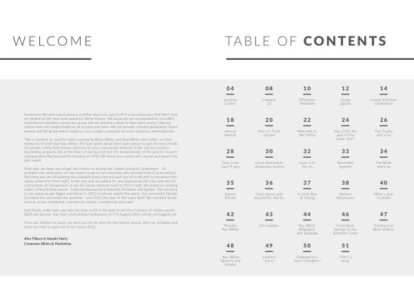 Next year we hope you all get the chance to attend our Career Lifecycle Conference - it ’ s probably the conference no-one wants to go to but everyone who attends finds it so beneficial . We know you are all building very valuable assets and we want you all to be able to maximise their values when the time ’ s right . In the last year we added 51 new businesses this year and saw 26 restructures of changeovers to see the family network swell to 933 in total . We loved our Leading Ladies of Real Estate events - held simultaneously in Adelaide , Brisbane and Sydney . This initiative is only going to get bigger and better in 2022 so please watch this space . Our economist Nerida Conisbee has answered the question - was 2021 the year of the super deal ? We certainly broke records across residential , commercial , marine , commercial and rural !