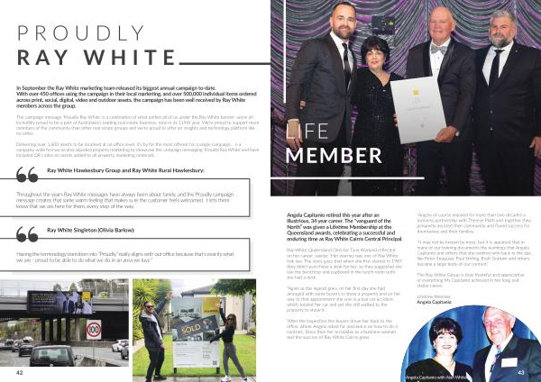 The campaign message ‘ Proudly Ray White ’ is a celebration of what unifies all of us under the Ray White banner- we ’ re all incredibly proud to be a part of Australasia ’ s leading real estate business , now in its 119th year . We ’ re proud to support more members of the community than other real estate groups and we ’ re proud to offer an insights and technology platform like no other .