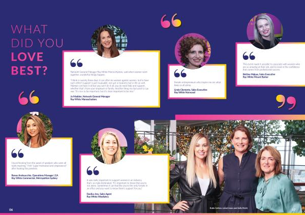 It was really well split between different roles in the industry . I loved chatting to This event made it possible to associate with women who Tahlia afterwards who had said ‘ you ’ re are so amazing at their job , and to revel in the confidence never too good for training .’ So that was that comes from professional success . really important as I always like to learn more Bettina and Malpas go to training , Sales Executive .” Ray White Mount Barker