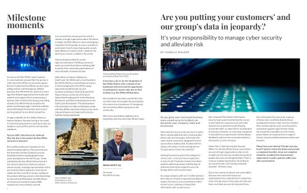 As soon as the Ray White name is spoken , it ’ s automatically assumed that the person is referring to Ray White as real estate agents . But few realise that Ray White can also mean selling marine craft through our affiliate business , Ray White Marine . Some nine years ago , Rick Rodwell approached the family and asked if we ’ d support him in commencing a business that related to the buying and selling of boats . Ray White Marine would be the perfect marketing image ! I loved his ambition and so Rick began his business and it wasn ’ t too long before his son , Brock , joined him .
