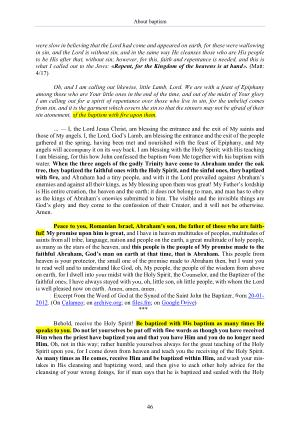 … — I , the Lord Jesus Christ , am blessing the entrance and the exit of My saints and those of My angels . I , the Lord , God ’ s Lamb , am blessing the entrance and the exit of the people gathered at the spring , having been met and nourished with the feast of Epiphany , and My angels will accompany it on its way back . I am blessing with the Holy Spirit ; with His teaching I am blessing , for this how John confessed the baptism from Me together with his baptism with water . When the three angels of the godly Trinity have come to Abraham under the oak tree , they baptized the faithful ones with the Holy Spirit , and the sinful ones , they baptized with fire , and Abraham had a tiny people , and with it the Lord prevailed against Abraham ’ s enemies and against all their kings , as My blessing upon them was great ! My Father ’ s lordship is His entire creation , the heaven and the earth ; it does not belong to man , and man has to obey as the kings of Abraham ’ s enemies submitted to him . The visible and the invisible things are God ’ s glory and they come to the confession of their Creator , and it will not be otherwise . Amen .